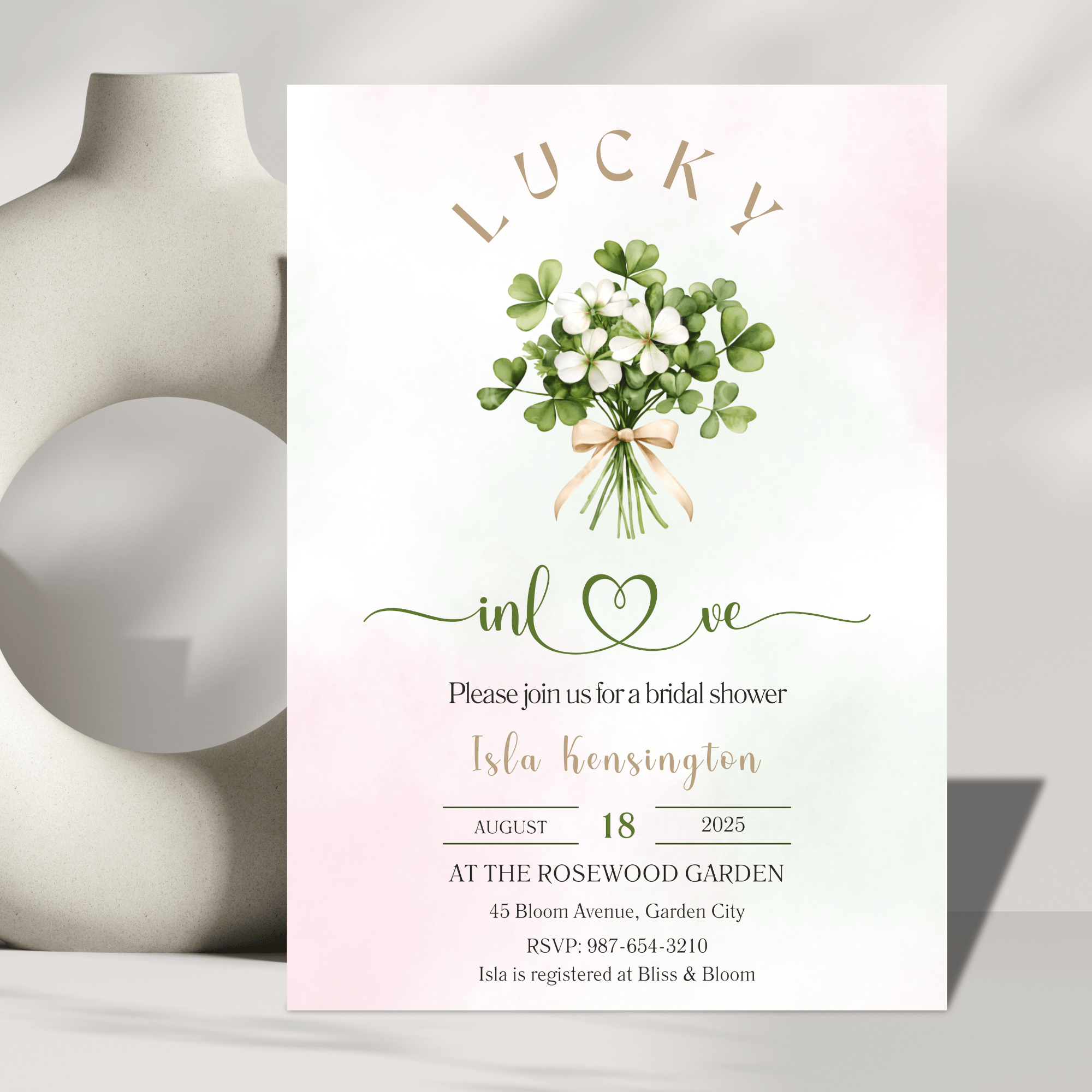 Celebrate the bride-to-be with a charming Lucky in Love bridal shower invitation featuring soft sage green tones and delicate shamrock details. Perfect for an Irish-inspired celebration or a March bridal shower, this elegant 5×7 invite blends romance with subtle festive charm.